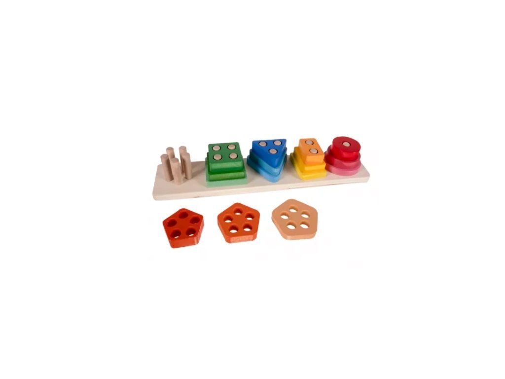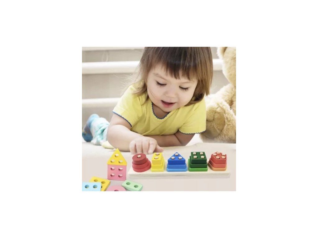 Poznávání tvarů a logiky: Pět základních geometrických tvarů (kruh, čtverec, trojúhelník, obdélník a pětiúhelník) učí děti rozpoznávat řád a logické vazby.