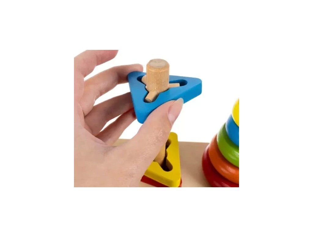 Senzorická pyramida: Třetí věž slouží k budování barevné pyramidy z prstenců zakončené červenou koulí. Rozvíjí odhad velikosti a harmonii tvarů.