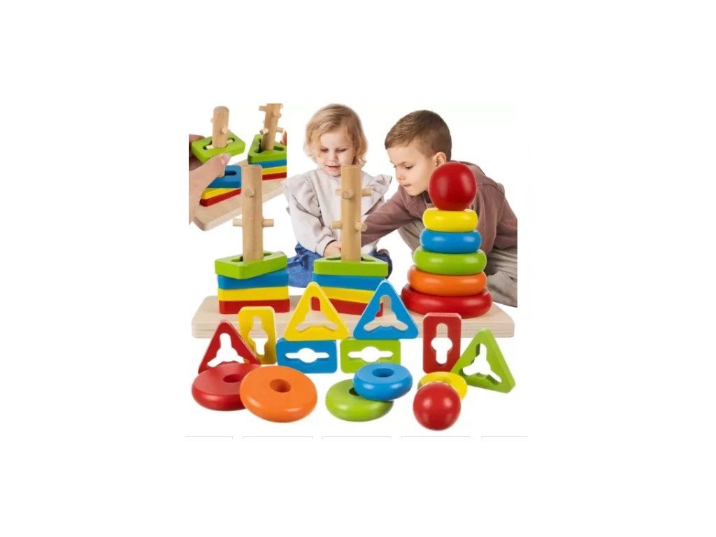 Hmatový „Twist“ zážitek: Věže pro trojúhelníky a obdélníky jsou osazeny postranními kolíky. Dítě musí dílkem rotovat v prostoru, aby proklouzlo dál. Tento rytmický pohyb je nesmírně uspokojující (podobně jako u mechanických fidgetů pro dospělé).